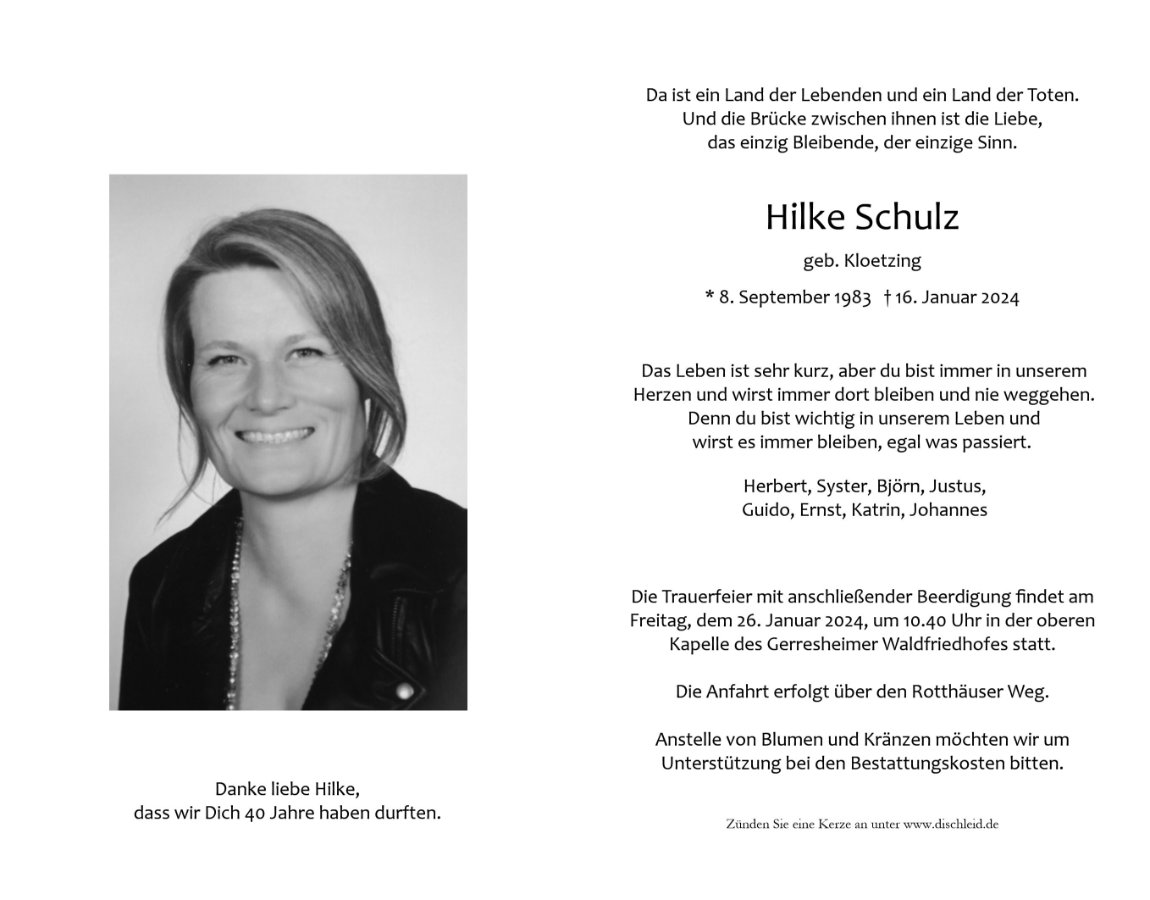 Liebe Syster, lieber Herbert, lieber Ernst, mit Bestürzung erfahre ich soeben von Hilkes Tod. Ich wünsche Euch viel Kraft!