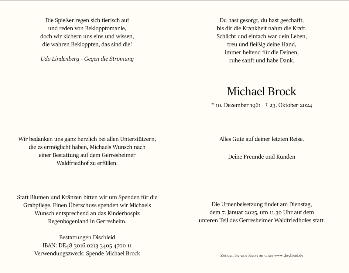 Sprechen Sie im Kondolenzbuch den Hinterbliebenen Ihr Beileid aus und teilen Sie persönliche Gedanken und Erinnerungen mit anderen.
